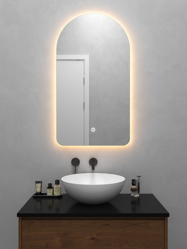 Безрамное зеркало арочной формы с контурной (тыльной) тёплой подсветкой, свет 3000К. Подложка из высококачественного МДФ, светодиодная лента защищена матовым свето-рассеивателем от попадания пыли и влаги. Есть вывод 220W для подключения к сети, включение подсветки от сенсорной кнопки на зеркале.